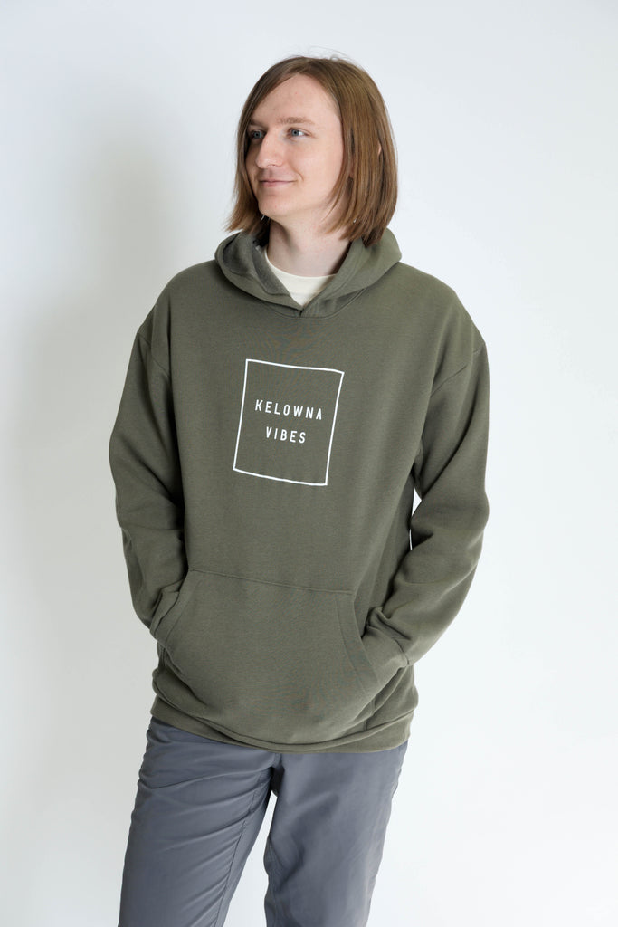 Throw on our classic green hoodie, the perfect layer for a day at the farmers’ market or nights downtown. Featuring our 'Kelowna Vibes' logo in a sleek box, this unisex hoodie is a versatile, comfortable staple for any wardrobe.